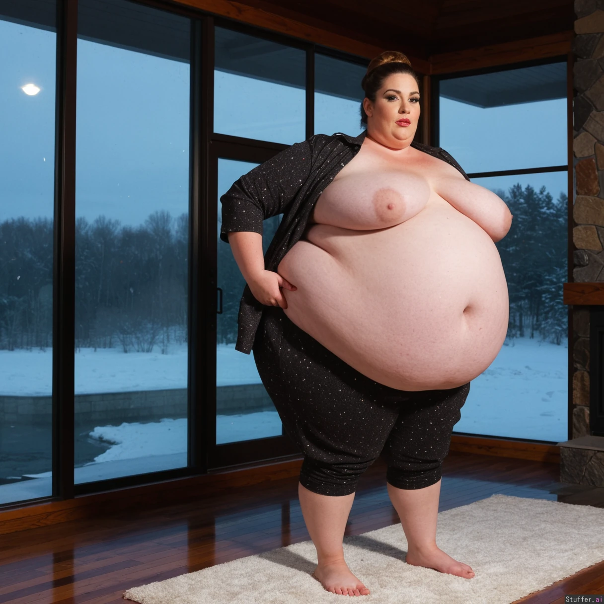 (A vintage portrait of subject walking casually under sun, snow effects, high contrast, cinematic set in America style, emotional intensity), Extremely detailed ,(Middle aged hot milf, hot eyes,big_cheekbones,fat_lips,thick_eyebrows), (small tits,plump,bigass,fat arms, massive fat belly:1.1), (wearing custom clothing outfit ,fully clothed:1.3) ,(, looking desperately at viewer), (cinematic realistic universe:1.4),(feet, fullbody view :1.6), massive wooden modern glass house, fireplace, moody atmosphere, morning, river,( gigantic belly :1.6).