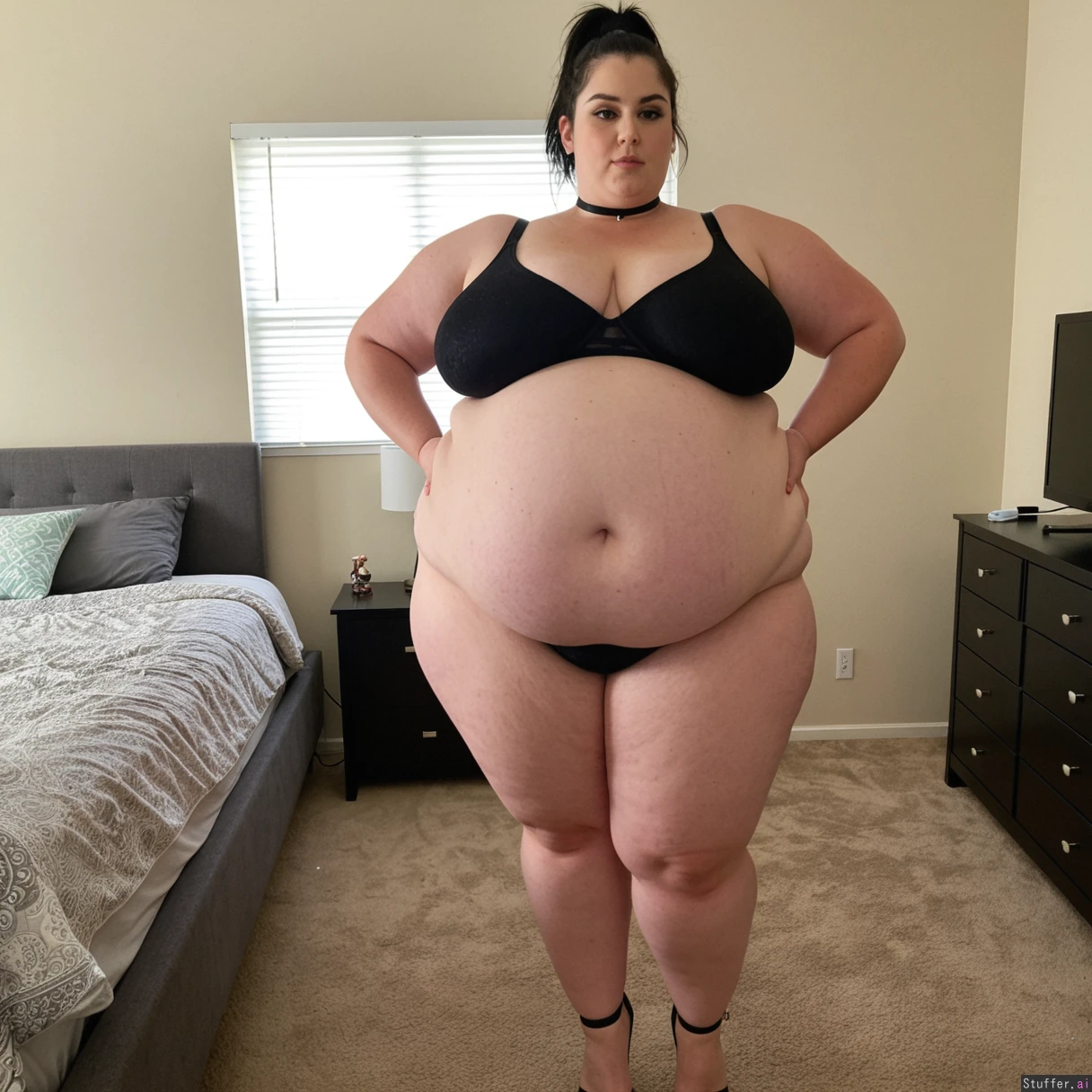 Beautiful fat southern European woman, pawg, bimbo, black hair, messy ponytail, giant fat belly, former model, wearing black lingerie, a choker, and high heels, she is standing, holding her soft gigantic belly, massive fat belly, stretch marks, 300 lbs belly, in a bedroom