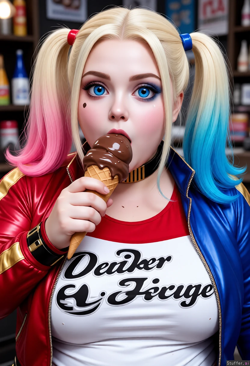 Obese Harley Quinn eating a chocolate ice cream cone, big beautiful blue eyes