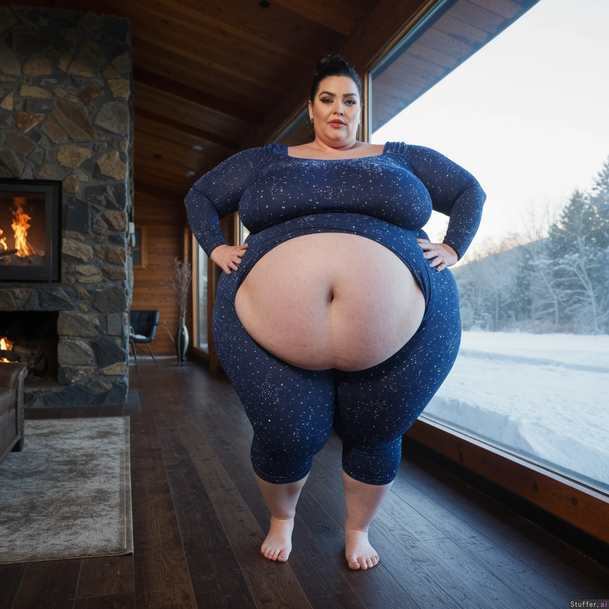 (A vintage portrait of subject walking casually under sun, snow effects, high contrast, cinematic set in America style, emotional intensity), Extremely detailed ,(Middle aged hot milf, hot eyes,big_cheekbones,fat_lips,thick_eyebrows), (small tits,plump,bigass,fat arms, massive fat belly:1.1), (wearing custom clothing outfit ,fully clothed:1.3) ,(, looking desperately at viewer), (cinematic realistic universe:1.4),(feet, fullbody view :1.6), massive wooden modern glass house, fireplace, moody atmosphere, morning, river,( gigantic belly :1.6).