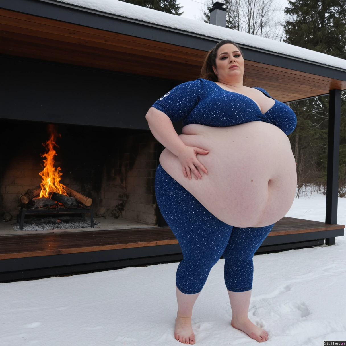(A vintage portrait of subject walking casually under sun, snow effects, high contrast, cinematic set in America style, emotional intensity), Extremely detailed ,(Middle aged hot milf, hot eyes,big_cheekbones,fat_lips,thick_eyebrows), (small tits,plump,bigass,fat arms, massive fat belly:1.1), (wearing custom clothing outfit ,fully clothed:1.3) ,(, looking desperately at viewer), (cinematic realistic universe:1.4),(feet, fullbody view :1.6), massive wooden modern glass house, fireplace, moody atmosphere, morning, river,( gigantic belly :1.6).
