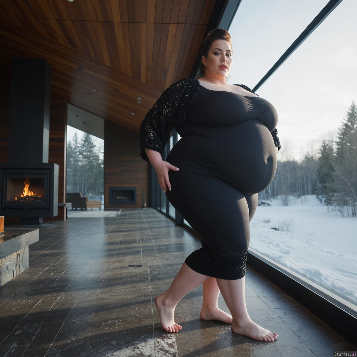 (A vintage portrait of subject walking casually under sun, snow effects, high contrast, cinematic set in America style, emotional intensity), Extremely detailed ,(Middle aged hot milf, hot eyes,big_cheekbones,fat_lips,thick_eyebrows), (small tits,plump,bigass,fat arms, massive fat belly:1.1), (wearing high fashion clothing outfit ,fully clothed:1.3) ,(, looking desperately at viewer), (cinematic realistic universe:1.4),(feet, fullbody view :1.6), massive wooden modern glass house, fireplace, moody atmosphere, morning, river,( gigantic belly :1.4).