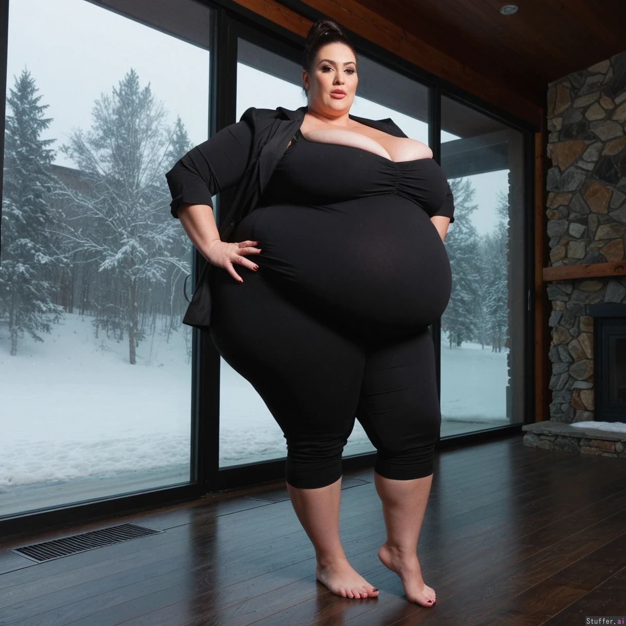 (A vintage portrait of subject walking casually under sun, snow effects, high contrast, cinematic set in America style, emotional intensity), Extremely detailed ,(Middle aged hot milf, hot eyes,big_cheekbones,fat_lips,thick_eyebrows), (small tits,plump,bigass,fat arms, massive fat belly:1.1), (wearing high fashion clothing outfit ,fully clothed:1.3) ,(, looking desperately at viewer), (cinematic realistic universe:1.4),(feet, fullbody view :1.6), massive wooden modern glass house, fireplace, moody atmosphere, morning, river,( gigantic belly :1.4).