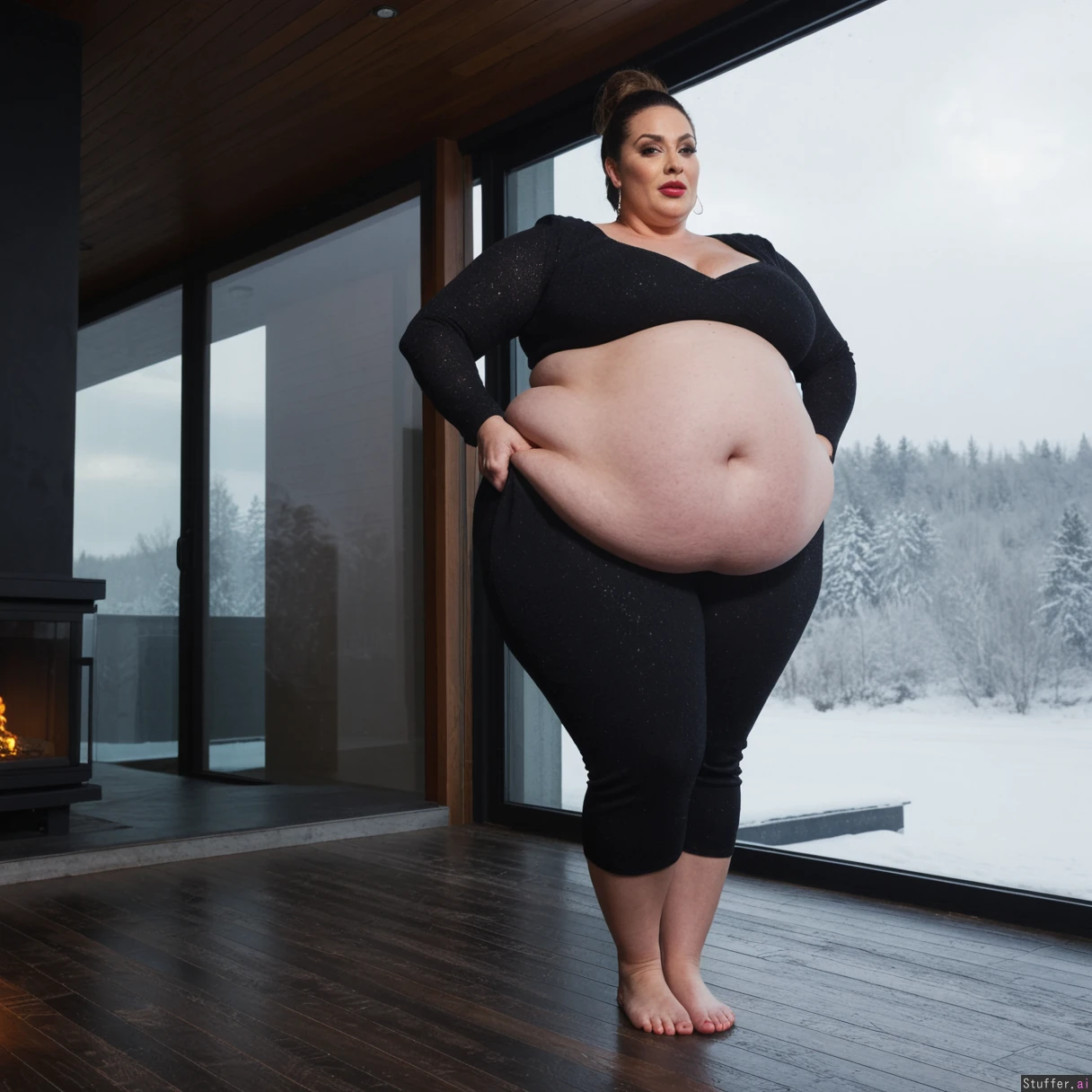(A vintage portrait of subject walking casually under sun, snow effects, high contrast, cinematic set in 1960 style, emotional intensity), Extremely detailed ,(Middle aged hot milf, hot eyes,big_cheekbones,fat_lips,thick_eyebrows), (small tits,plump,bigass,fat arms, massive fat belly:1.1), (wearing high fashion clothing outfit ,fully clothed:1.3) ,(, looking desperately at viewer), (cinematic realistic universe:1.4),(feet, fullbody view :1.6), massive wooden modern glass house, fireplace, moody atmosphere, morning, river,( gigantic belly :1.4).