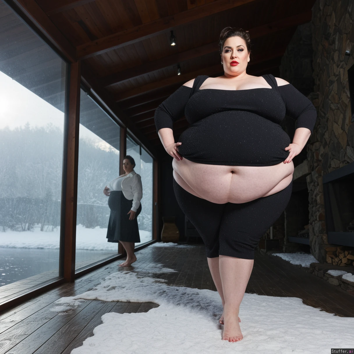 (A vintage portrait of subject walking casually under sun, snow effects, high contrast, cinematic set in 1930 style, emotional intensity), Extremely detailed ,(Middle aged hot milf, hot eyes,big_cheekbones,fat_lips,thick_eyebrows), (small tits,plump,bigass,fat arms, massive fat belly:1.1), (wearing high fashion clothing outfit ,fully clothed:1.3) ,(, looking desperately at viewer), (cinematic realistic universe:1.4),(feet, fullbody view :1.6), massive wooden modern glass house, fireplace, moody atmosphere, morning, river,( gigantic belly :1.4).