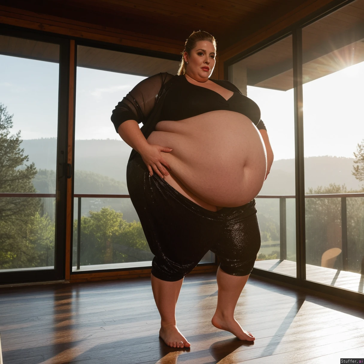 (A vintage portrait of subject walking casually under sun, heaven effects, high contrast, cinematic set in 1980s style, emotional intensity), Extremely detailed ,(Middle aged hot milf, hot eyes,big_cheekbones,fat_lips,thick_eyebrows), (small tits,plump,bigass,fat arms, massive fat belly:1.1), (wearing high fashion clothing outfit ,fully clothed:1.3) ,(, looking desperately at viewer), (cinematic realistic universe:1.4),(feet, fullbody view :1.6), massive wooden modern glass house, fireplace, moody atmosphere, morning, river,( gigantic belly :1.4).