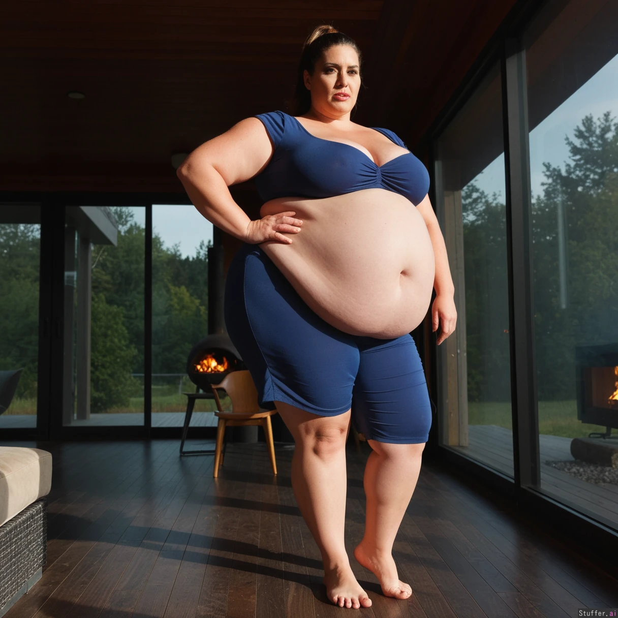 (A vintage portrait of subject walking casually under sun, summer effects, high contrast, cinematic set in 1980s style, emotional intensity), Extremely detailed ,(Middle aged hot milf, hot eyes,big_cheekbones,fat_lips,thick_eyebrows), (small tits,plump,bigass,fat arms, massive fat belly:1.1), (wearing high fashion clothing outfit ,fully clothed:1.3) ,(, looking desperately at viewer), (cinematic realistic universe:1.4),(feet, fullbody view :1.6), massive wooden modern glass house, fireplace, moody atmosphere, morning, river,( gigantic belly :1.4).