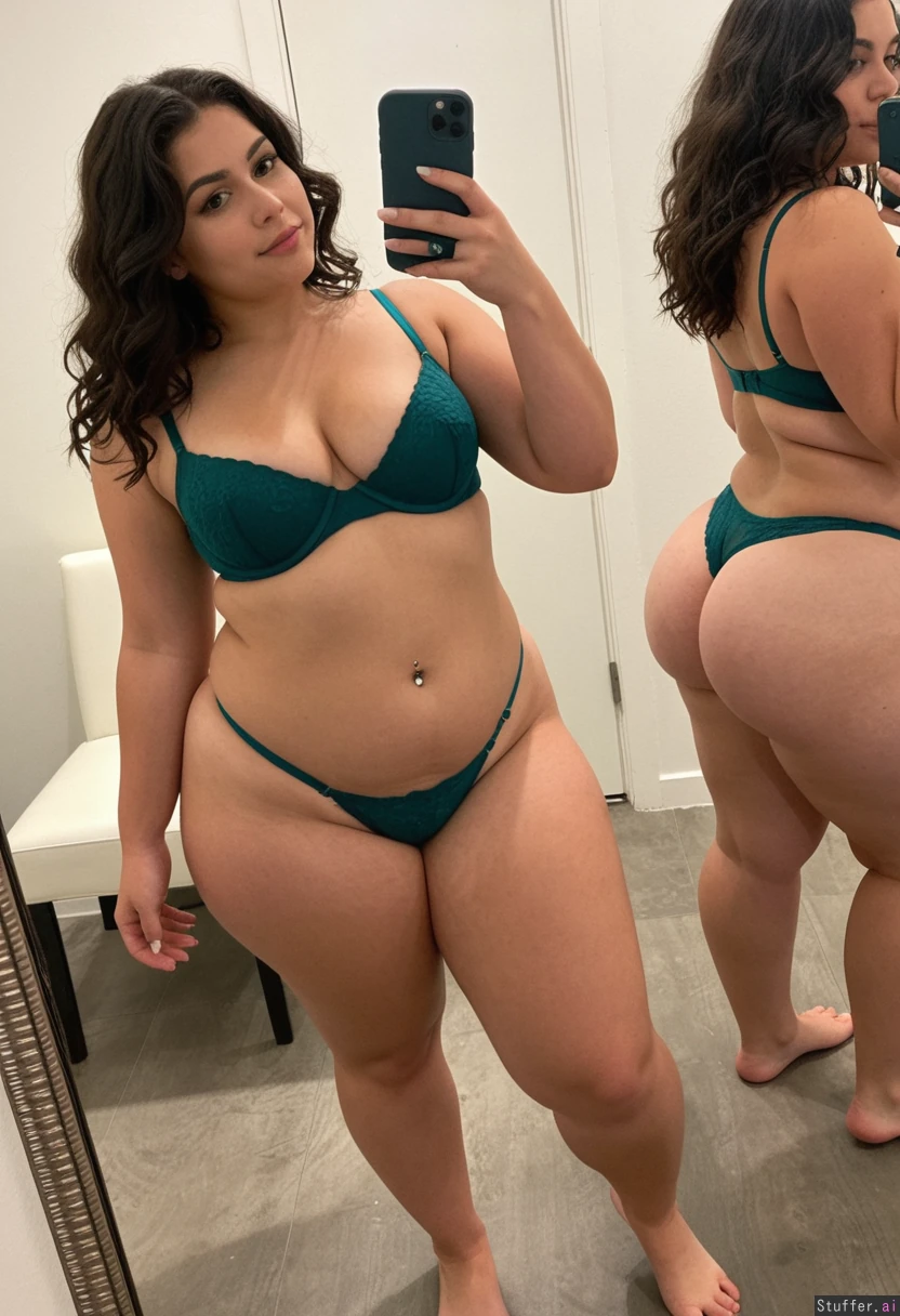 A short statured gorgeous (beautiful popular girl model face) Latina woman with dark wavy hair wearing a dark green thong and bra barefoot, Standing taking a mirror selfie. She is a shortstack , pear-shaped_figure, (wide hips) (thick thighs) (small breasts) (bellybutton piercing) (very chubby) (bottom heavy) (gaining weight) Real life, realistic , best_quality