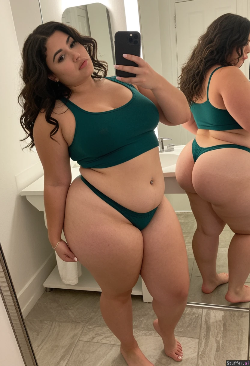 A short statured gorgeous (beautiful popular girl model face) Latina woman with dark wavy hair wearing a dark green thong and tank top barefoot, Standing taking a mirror selfie. She is frowning. She is a shortstack , pear-shaped_figure, (wide hips) (thick thighs) (small breasts) (bellybutton piercing) (extemely obsese) (bottom heavy) (bbw) Real life, realistic , best_quality