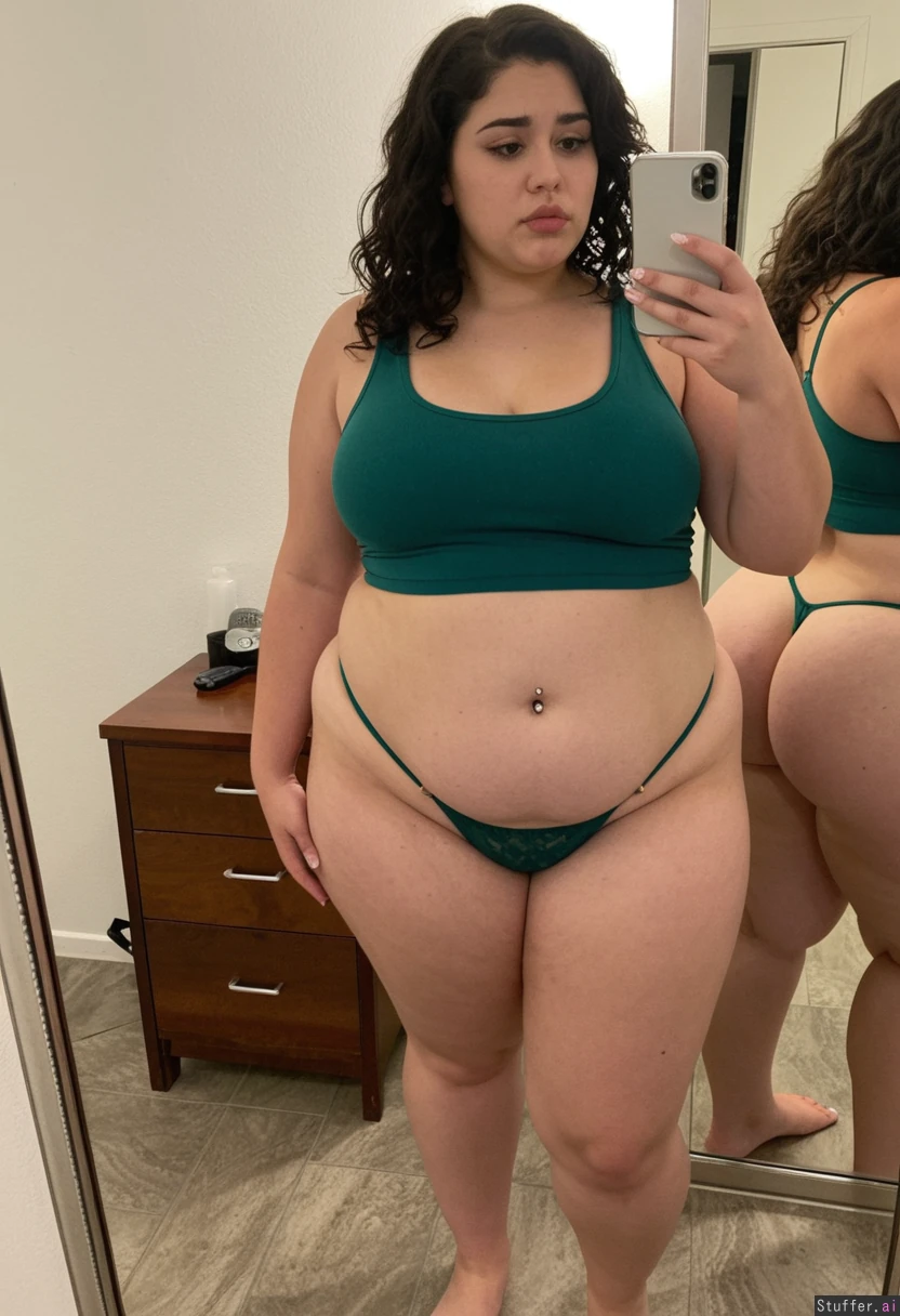 A short statured gorgeous (beautiful popular girl model face) Latina woman with dark wavy hair wearing a dark green thong and tank top barefoot, Standing taking a mirror selfie. She is frowning. She is a shortstack , pear-shaped_figure, (wide hips) (thick thighs) (small breasts) (bellybutton piercing) (extemely obese) (bottom heavy) (gaining weight) (bbw) Real life, realistic , best_quality