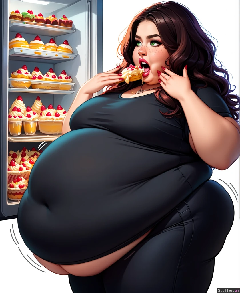 (ultrarealistic life-like photo:1.5), Chloe is a gorgeous 20-year-old caucasian fat girl, (((Eyeliner, green eyes, pink lipstick, freckles, mascara, the contrast between her gorgeous 20-year-old slender supermodel face and the rest of her obese 5 foot tall body is extremely emphasized))), Huge_Voluminous_blonde_hair, elegant, cute, beautiful, realistic, black yoga pants, tight pink t-shirt, Chloe must be fully clothed, (Soft, almost obese, thick arms and shoulders), (Chloe is in her dorm), necklace, side view, red nails, zoomed out shot, Recent massive college weight gain, fat rolls, she is in her kitchen, her weight gain is giving her a disproportionately fat-filled pot belly, her belly is completely covered by her black t-shirt, Chloe lives an extremely gluttonous and indulgent lifestyle, fupa, (she is gluttonously and messily eating desserts directly out of her fridge, she is standing, she is facing the fridge, instant weight gain, the fattening desserts are causing her to gain fat instantly with every bite, most of the weight gain is going straight to her belly, she is moaning sensually, she is aggressively shoving the desserts into her mouth with her hands, extreme glutton, she is starving, all she can think about is eating more and more:1.5)