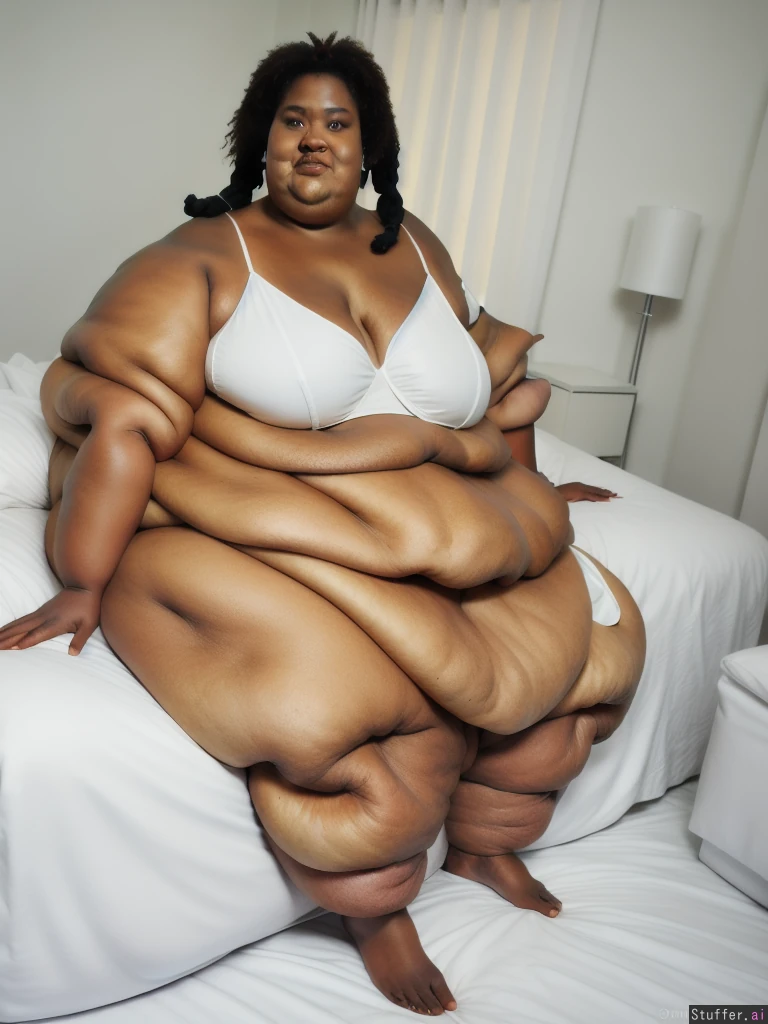 masterpiece, best quality, score_7. Photo realistic, ultra high quality, african ssbbw, beautiful face:1.4, (ultra double chin:1.9), (ultra fat face:1.9), ultra huge legs:1.9), (ultra huge arms:1.9), (ultra leg rolls:1.7), wearing a white bikini, sitting on a bed, black braided hair:1.4