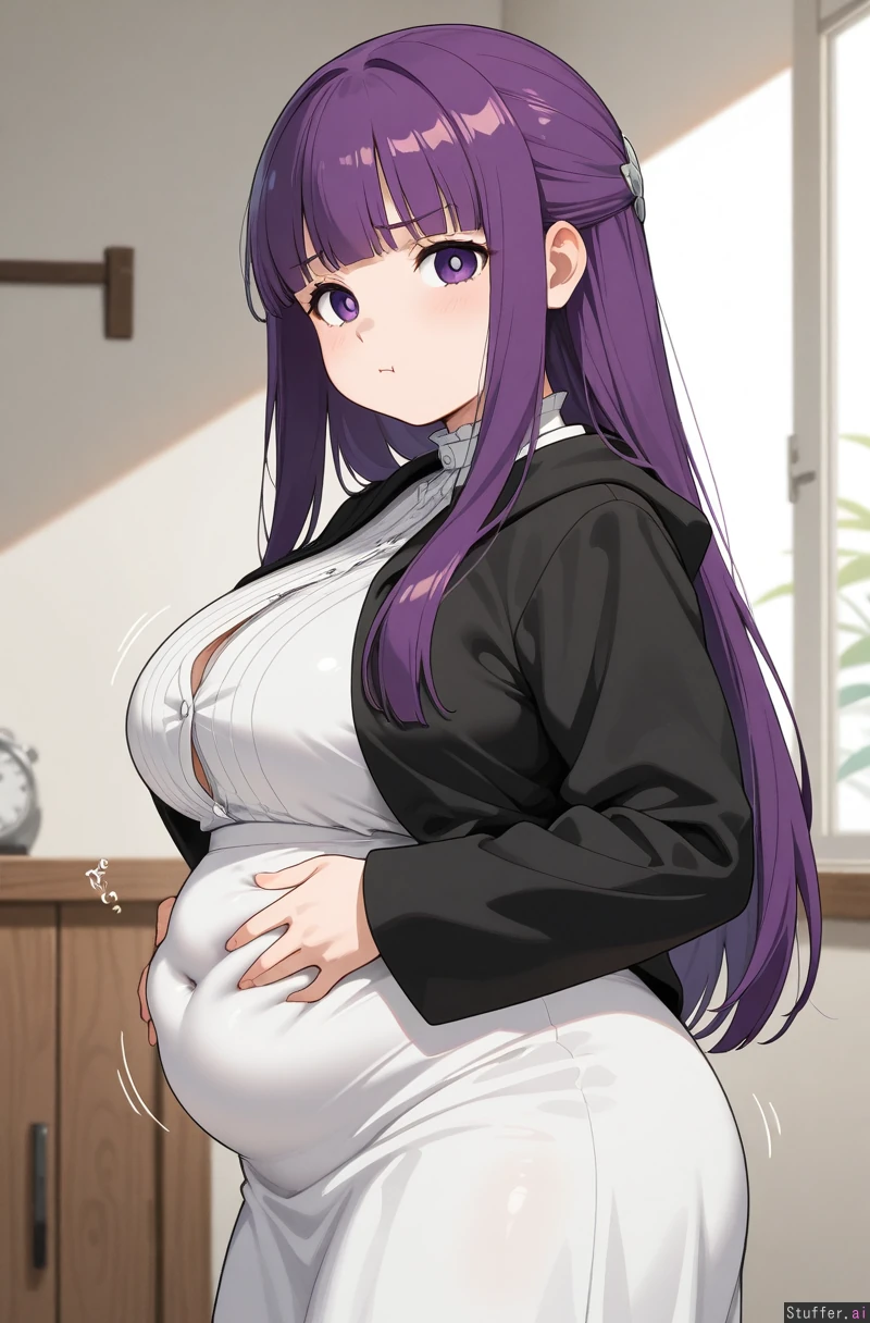 ((Fern from sousou no frieren)), ((pouting at viewer)), ((chubby belly:1.0)), ((straining buttons)), ((side view)), ((weight conscious))