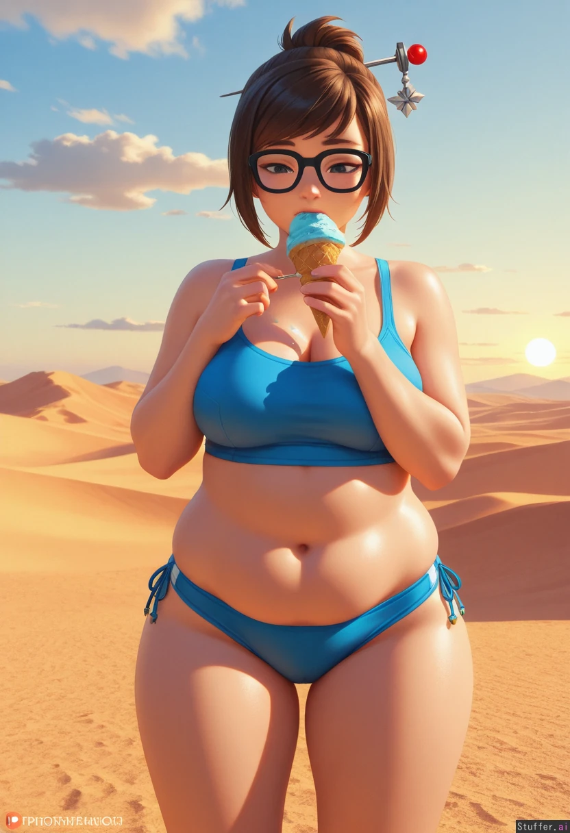 best_quality, hdr, overwatch, mei, clouds, desert, daytime, exhausted, eating, ice_cream, cone, (overweight:0.8), (wide_hips:0.8), (bottom_heavy:0.8), (belly:0.8), (contrast), (solo:1girl)