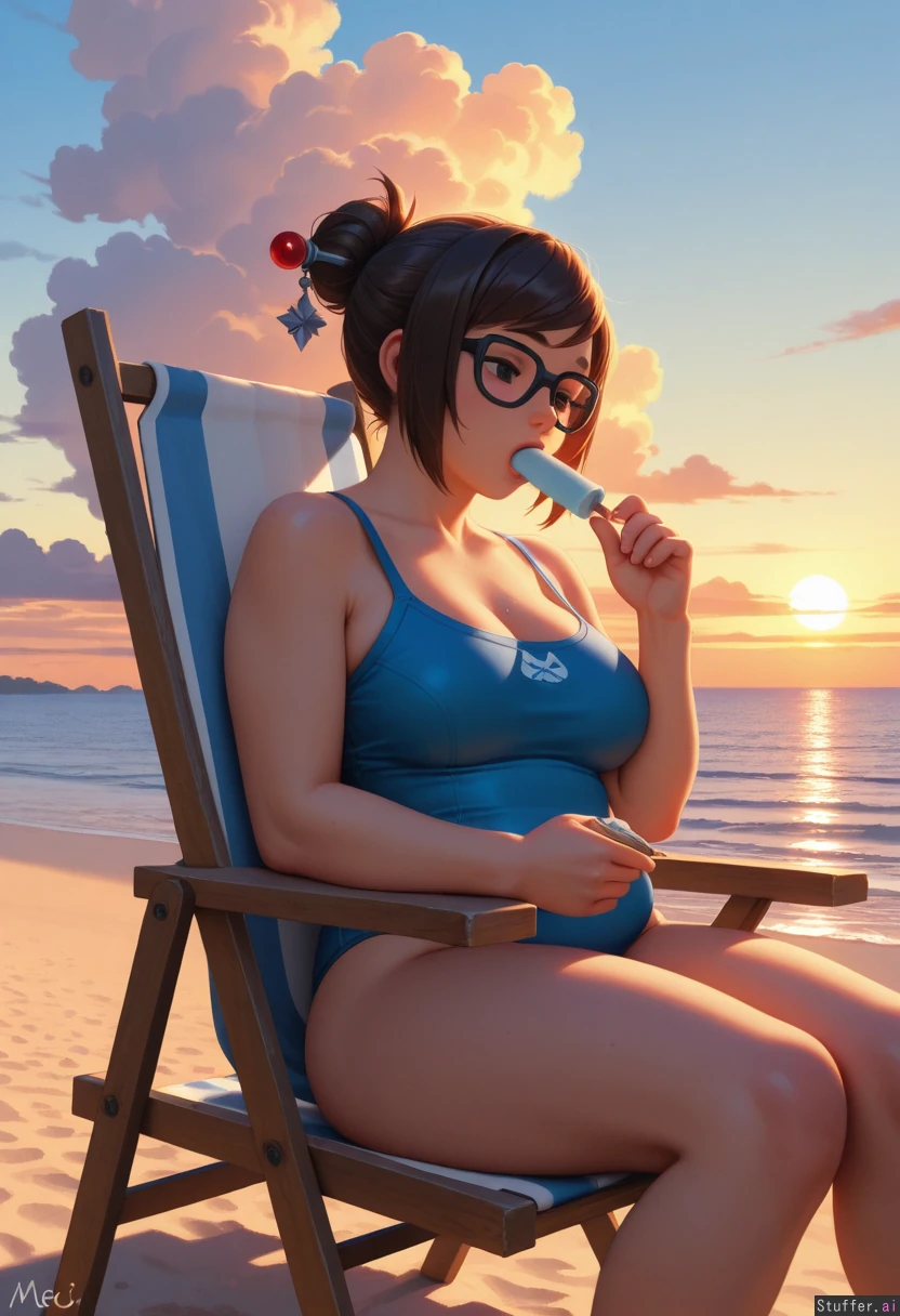 best_quality, hdr, overwatch, mei, clouds, beach, daytime, exhausted, eating, ice_cream, cone, sitting, deckchair, (overweight:0.7), (wide_hips:0.7), (bottom_heavy:0.7), (belly:0.7), (contrast), (solo:1girl)