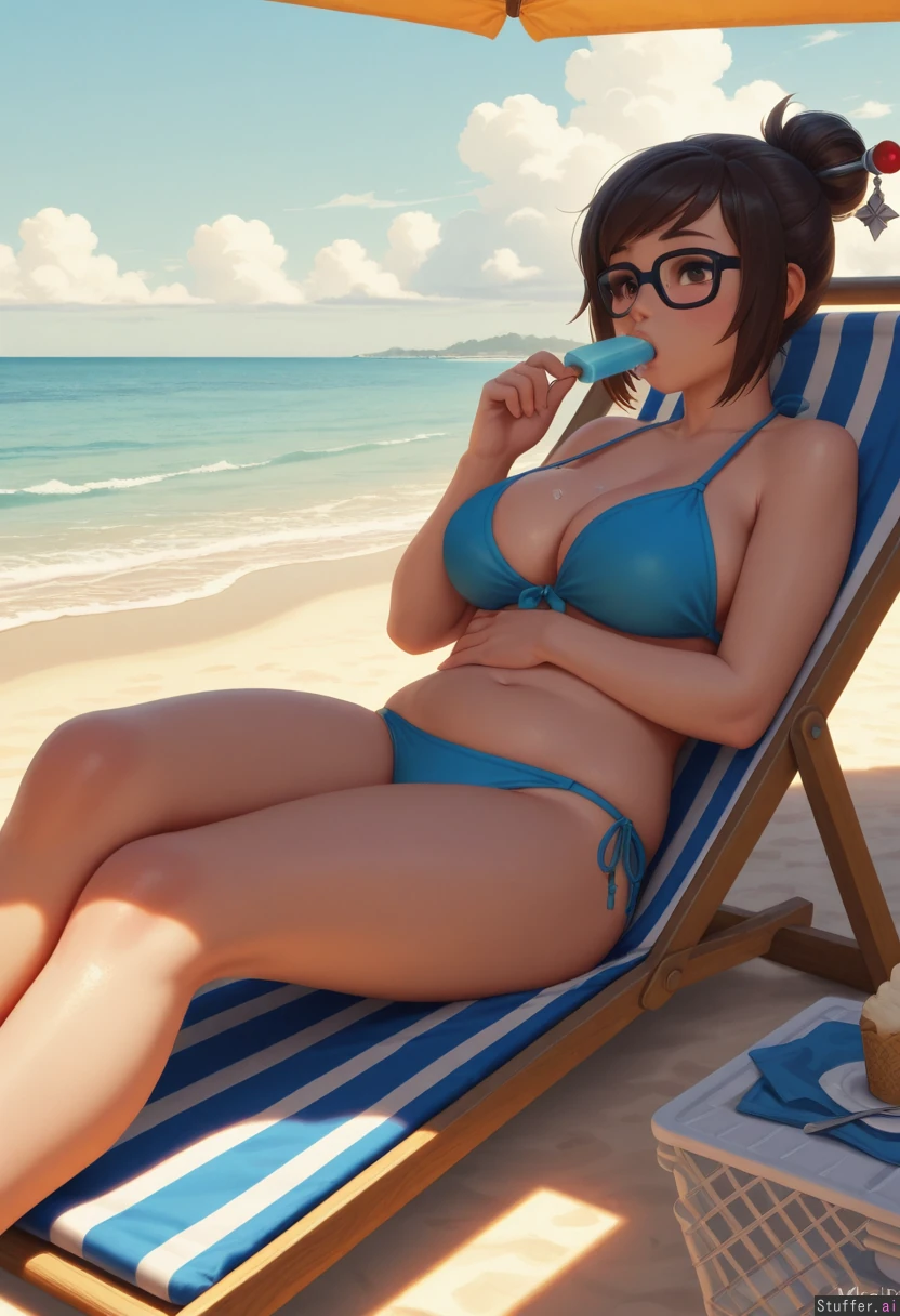 best_quality, hdr, overwatch, mei, clouds, beach, daytime, exhausted, eating, ice_cream, cone, sitting, lying, deckchair, (overweight:0.5), (wide_hips:0.7), (bottom_heavy:0.7), (belly:0.5), (contrast), (solo:1girl)
