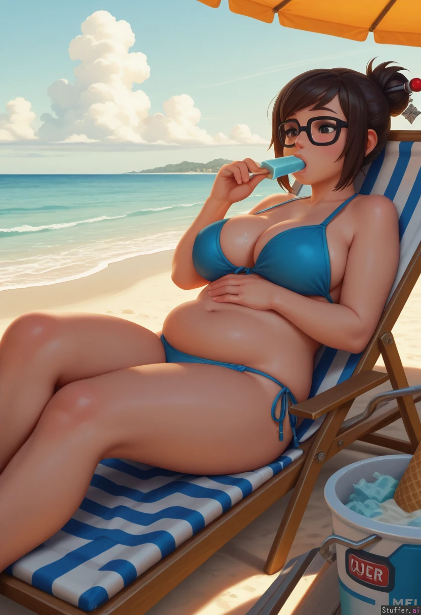 best_quality, hdr, overwatch, mei, clouds, beach, daytime, exhausted, eating, ice_cream, cone, sitting, lying, deckchair, (overweight:0.85), (wide_hips:0.7), (bottom_heavy:0.7), (belly:0.85), (contrast), (solo:1girl)