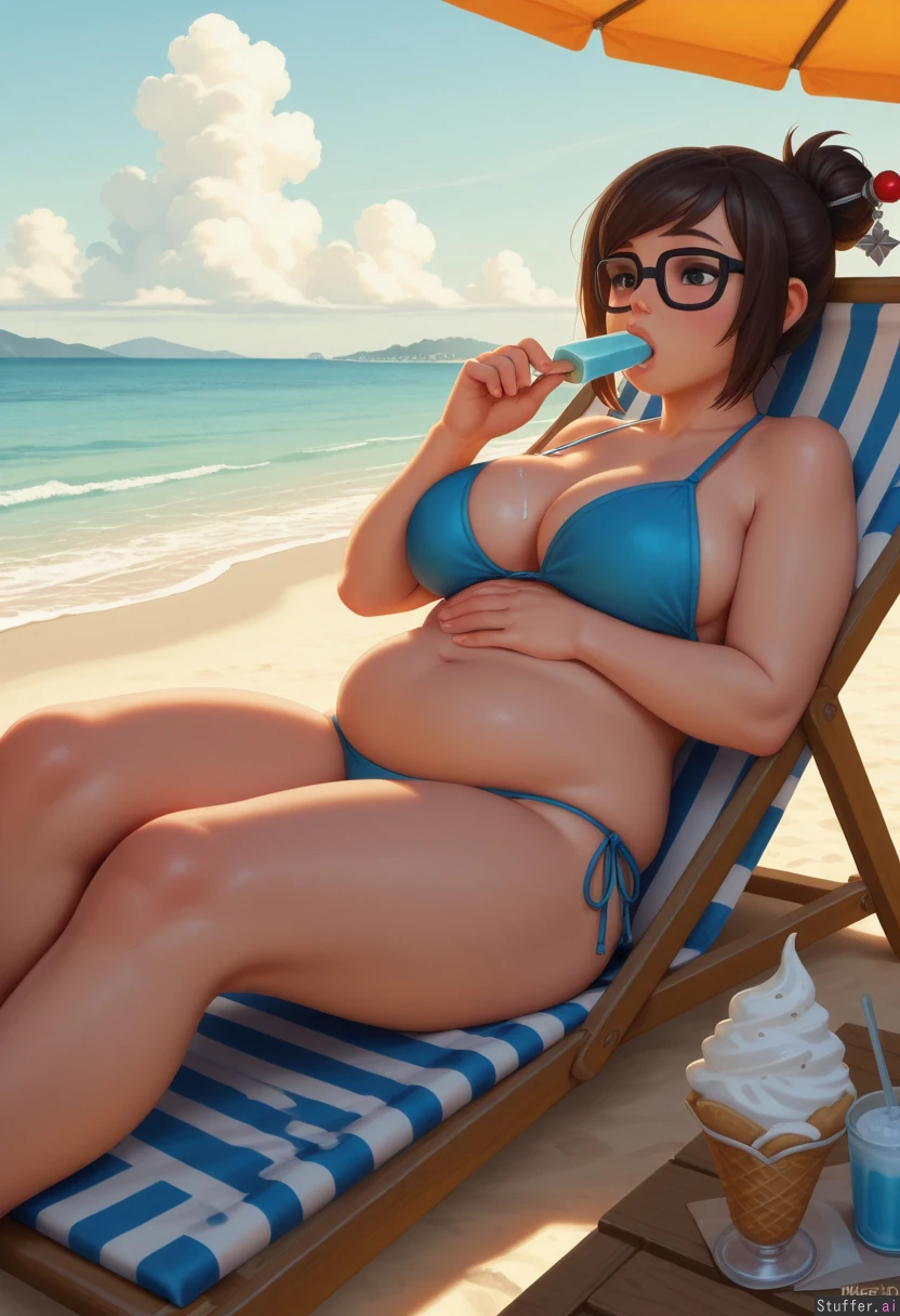 best_quality, hdr, overwatch, mei, clouds, beach, daytime, exhausted, eating, ice_cream, cone, sitting, lying, deckchair, (overweight:0.93), (wide_hips:0.7), (bottom_heavy:0.7), (belly:0.93), (contrast), (solo:1girl)