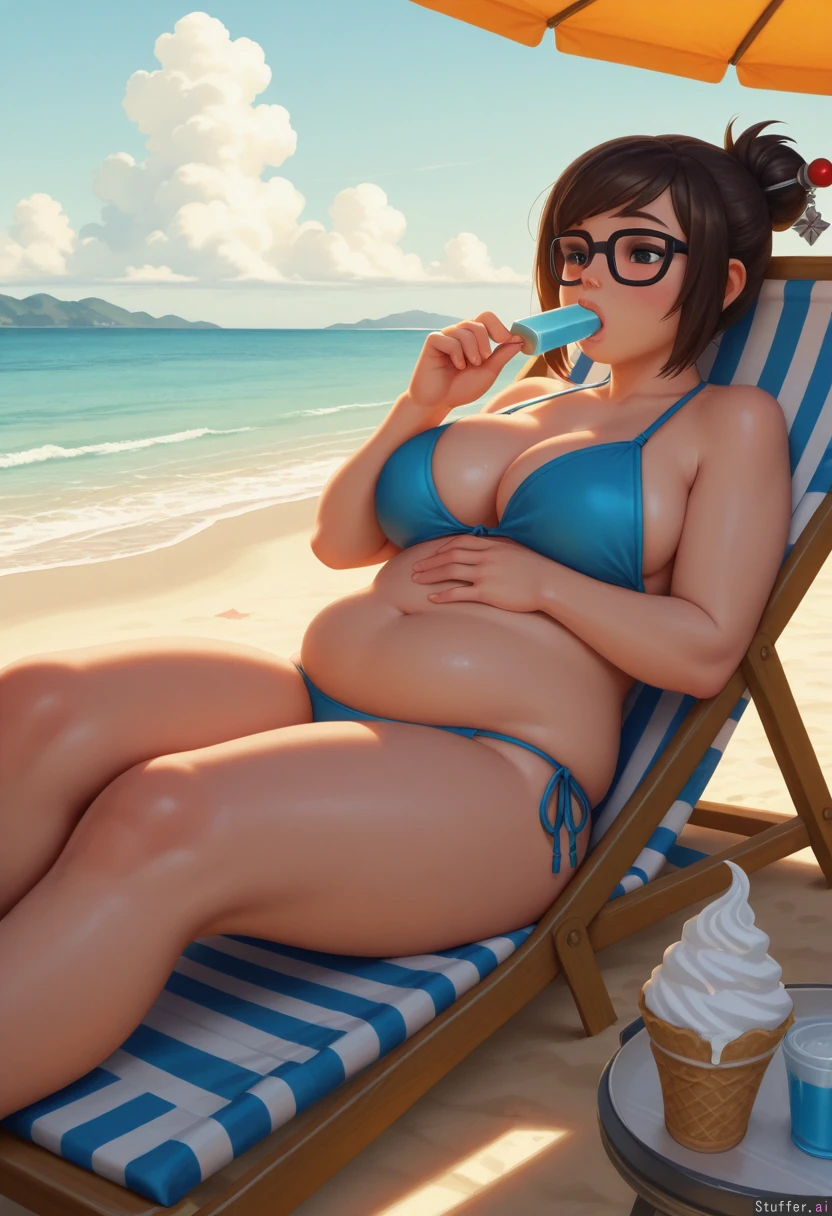 best_quality, hdr, overwatch, mei, clouds, beach, daytime, exhausted, eating, ice_cream, cone, sitting, lying, deckchair, (overweight:0.98), (wide_hips:0.7), (bottom_heavy:0.7), (belly:0.98), (contrast), (solo:1girl)