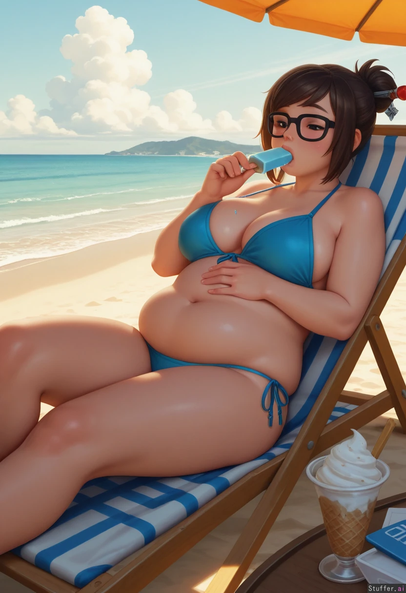 best_quality, hdr, overwatch, mei, clouds, beach, daytime, exhausted, eating, ice_cream, cone, sitting, lying, deckchair, (overweight:1.05), (wide_hips:0.7), (bottom_heavy:0.7), (belly:1.05), (contrast), (solo:1girl)