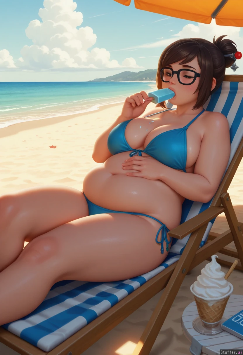 best_quality, hdr, overwatch, mei, clouds, beach, daytime, exhausted, eating, ice_cream, cone, sitting, lying, deckchair, (overweight:1.1), (wide_hips:0.7), (bottom_heavy:0.7), (belly:1.1), (contrast), (solo:1girl)