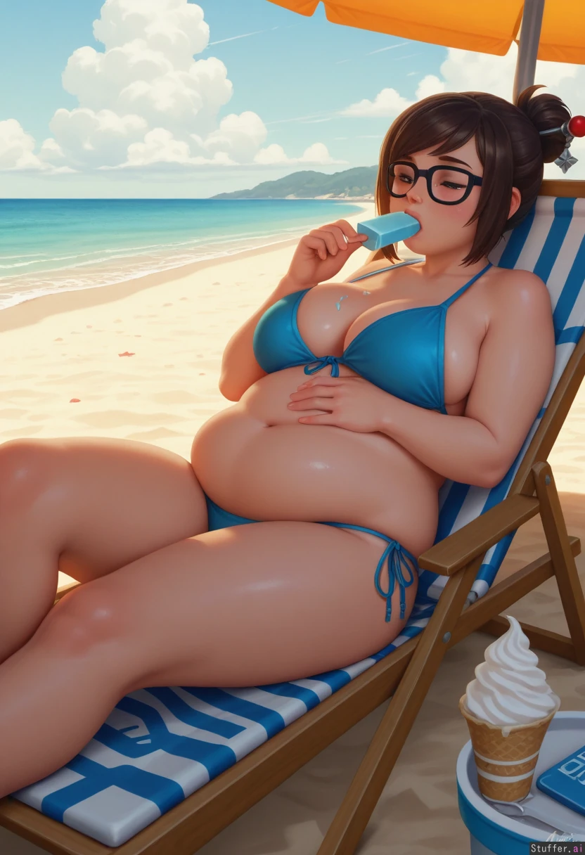 best_quality, hdr, overwatch, mei, clouds, beach, daytime, exhausted, eating, ice_cream, cone, sitting, lying, deckchair, (overweight:1.15), (wide_hips:0.7), (bottom_heavy:0.7), (belly:1.15), (contrast), (solo:1girl)