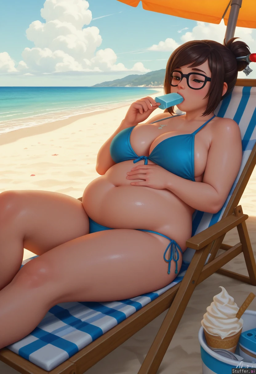 best_quality, hdr, overwatch, mei, clouds, beach, daytime, exhausted, eating, ice_cream, cone, sitting, lying, deckchair, (overweight:1.18), (wide_hips:0.7), (bottom_heavy:0.7), (belly:1.18), (contrast), (solo:1girl)
