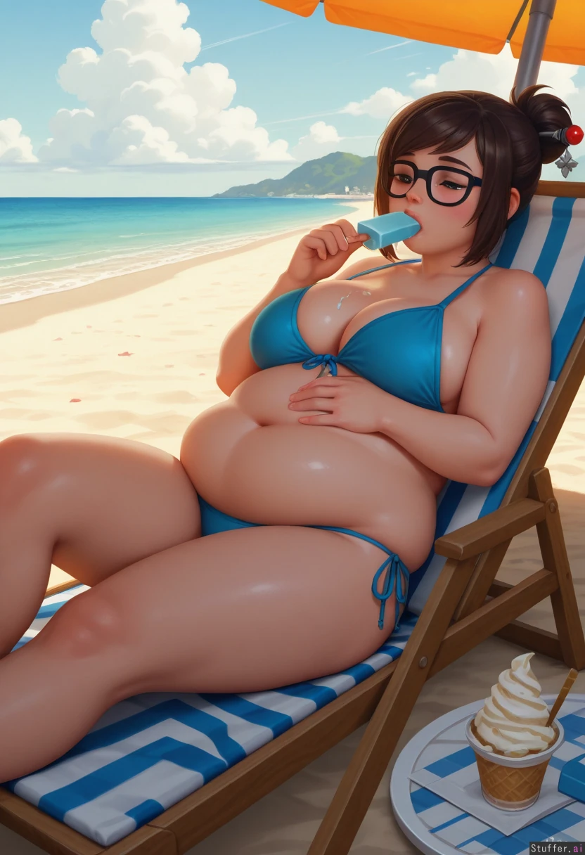 best_quality, hdr, overwatch, mei, clouds, beach, daytime, exhausted, eating, ice_cream, cone, sitting, lying, deckchair, (overweight:1.25), (wide_hips:0.7), (bottom_heavy:0.7), (belly:1.25), (contrast), (solo:1girl)