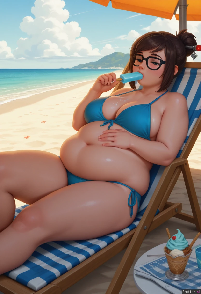 best_quality, hdr, overwatch, mei, clouds, beach, daytime, exhausted, eating, ice_cream, cone, sitting, lying, deckchair, (overweight:1.33), (wide_hips:0.7), (bottom_heavy:0.7), (belly:1.33), (contrast), (solo:1girl)