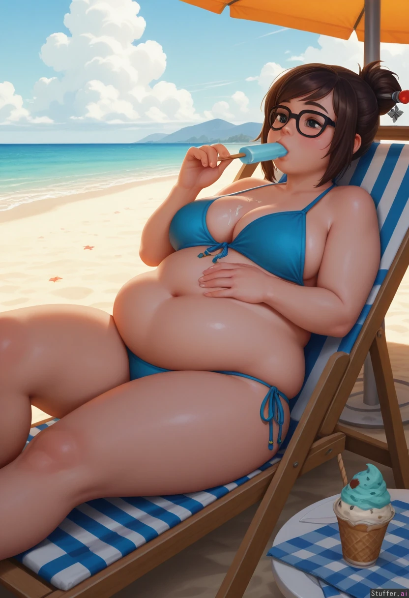 best_quality, hdr, overwatch, mei, clouds, beach, daytime, exhausted, eating, ice_cream, cone, sitting, lying, deckchair, (overweight:1.4), (wide_hips:0.7), (bottom_heavy:0.7), (belly:1.4), (contrast), (solo:1girl)