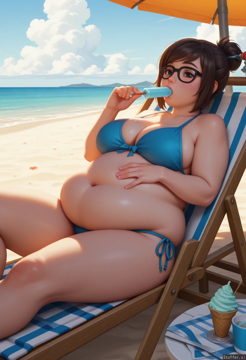 best_quality, hdr, overwatch, mei, clouds, beach, daytime, exhausted, eating, ice_cream, cone, sitting, lying, deckchair, (overweight:1.45), (wide_hips:0.7), (bottom_heavy:0.7), (belly:1.45), (contrast), (solo:1girl)