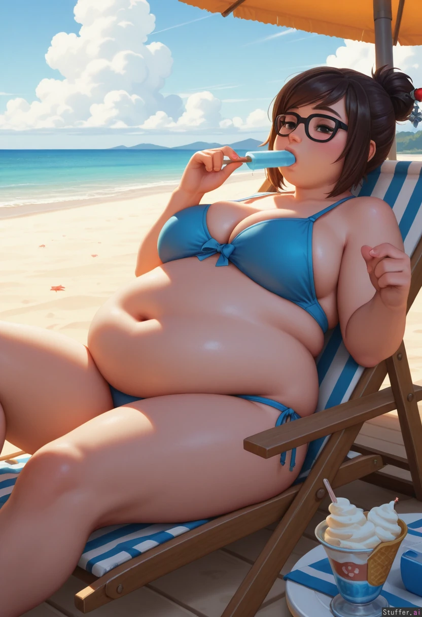 best_quality, hdr, overwatch, mei, clouds, beach, daytime, exhausted, eating, ice_cream, cone, sitting, lying, deckchair, (overweight:1.48), (wide_hips:0.7), (bottom_heavy:0.7), (belly:1.48), (contrast), (solo:1girl)