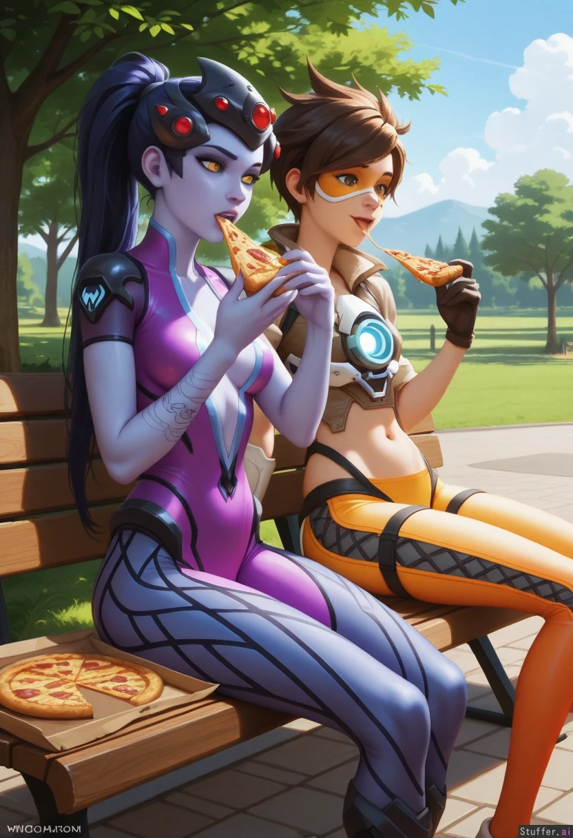 best_quality, hdr, overwatch, widowmaker, tracer, clouds, park, outside, daytime, bench, eating, pizza, sitting, relaxed, excited, (skinny:1.0), (overweight:0.7), (wide_hips:0.7), (bottom_heavy:0.7), (belly:0.7), (contrast), (duo:2girls)