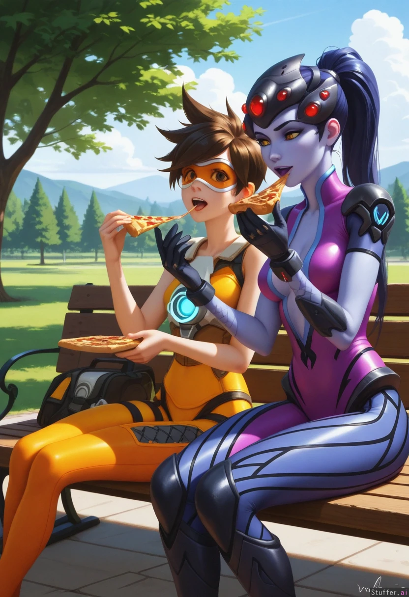 best_quality, hdr, overwatch, widowmaker, tracer, clouds, park, outside, daytime, bench, eating, pizza, sitting, relaxed, excited, (skinny:1.0), (overweight:0.7), (wide_hips:0.7), (bottom_heavy:0.7), (contrast), (duo:2girls)