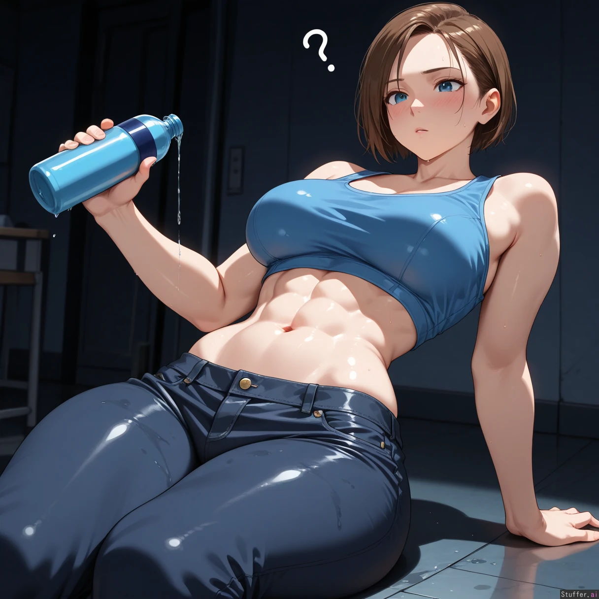 (((solo))), Jill Valentine, tomboy appearance, ((Wearing crop top)), (((highly detailed navel))), (dark lighting), (((dark room))), smooth_skin, (((dynamic pose))), wearing jeans, ((elongated midriff)), (((wide waist))), (((wide hips))), (((thick hips))), (((highly detailed abs))), cowboy shot, dripping wet, wet clothes, (holding blue bottle), (((sitting on floor))), leaning back, (tipsy), (confused), (blushing)