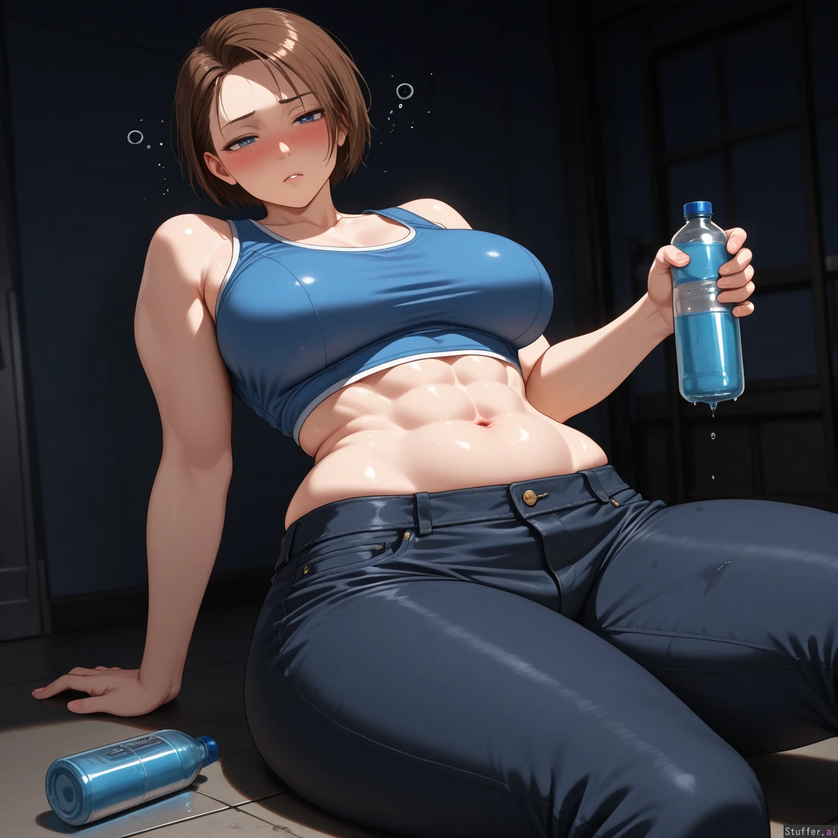(((solo))), Jill Valentine, tomboy appearance, ((Wearing crop top)), (((highly detailed navel))), (dark lighting), (((dark room))), smooth_skin, wearing jeans, ((elongated midriff)), (((wide waist))), (((wide hips))), (((thick hips))), (((highly detailed abs))), (slight belly fat), cowboy shot, dripping wet, wet clothes, (holding blue bottle), (((sitting on floor))), leaning back, (((drunk))), (confused expression), (blushing heavily), (((eyes half opened)))
