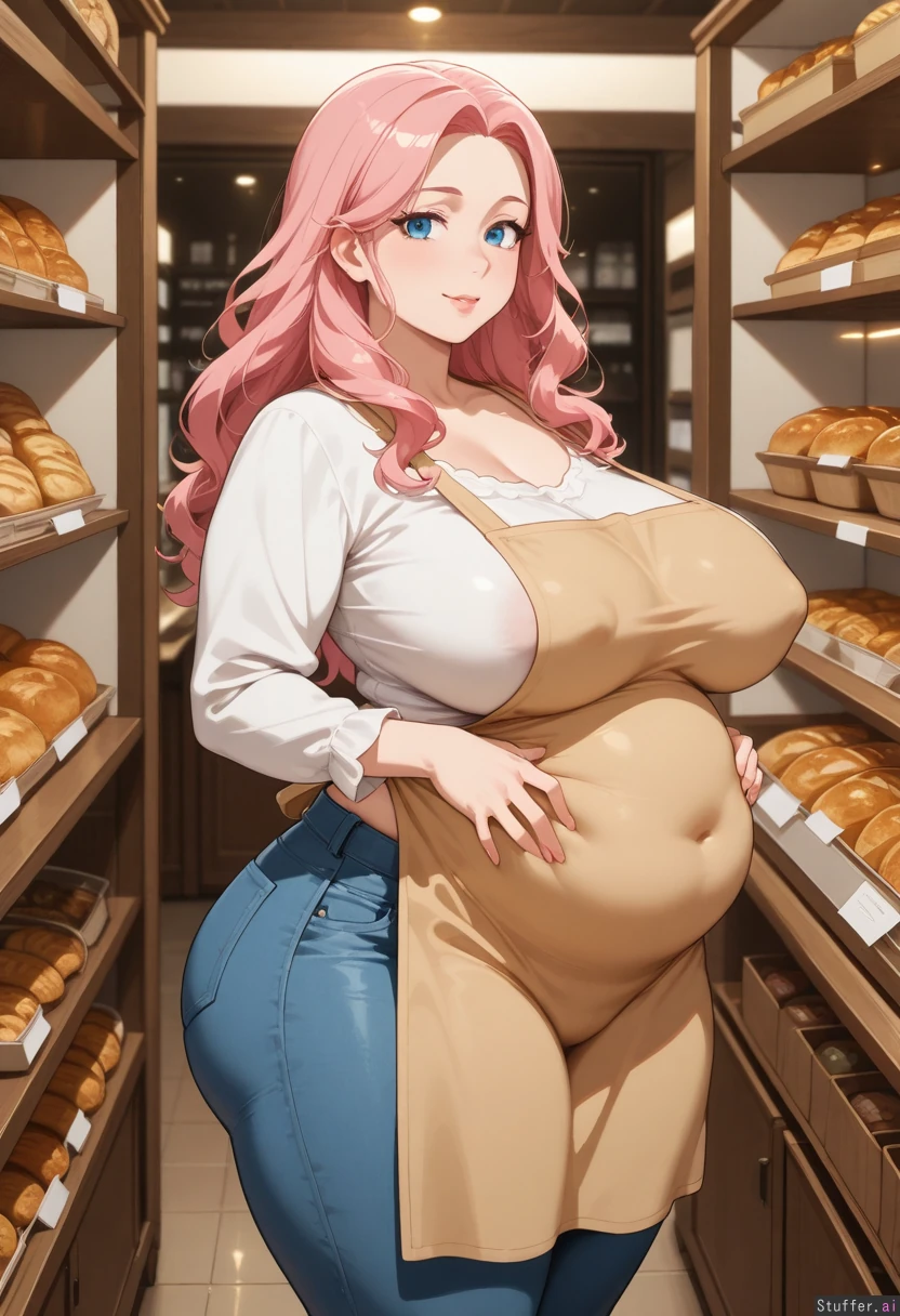 mature_female, blue_eyes, pink_hair, long_wavy_hair, shopping, bakery, apron, blouse, skinny_jeans wide_hips, thick_thighs, thick_ass, chubby, nipple_bulge, chubby_belly
