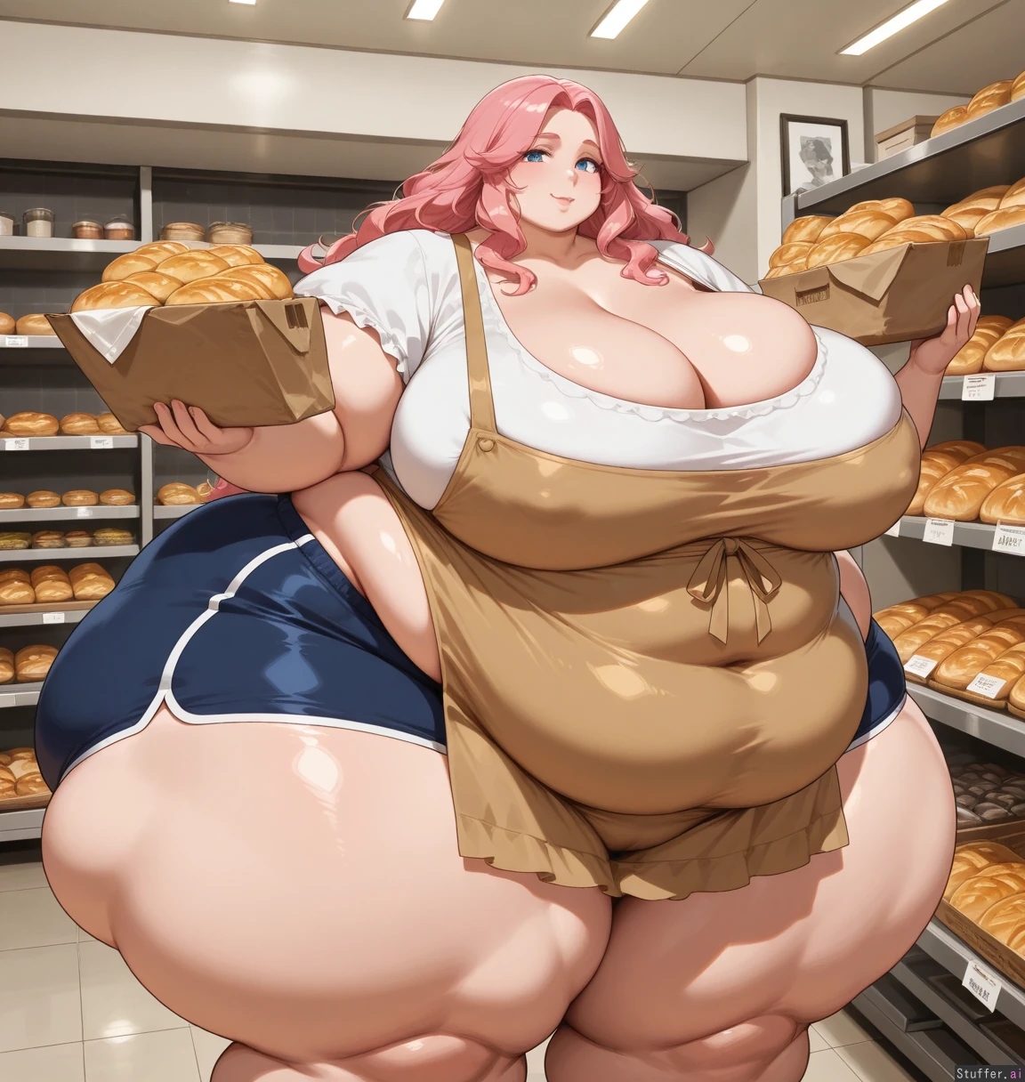 mature_female, blue_eyes, pink_hair, long_wavy_hair, shopping, bakery, apron, blouse, gym_shorts, wide_hips, hyper_hips, massive_hips, massive_thighs, thick_ass, obese, fat_face, fat, overweight, ass_crack, huge_thighs, (huge thick soft thighs:1.6), (obese_belly:1.3), nipple_bulge, cleavage_overflow, underbelly