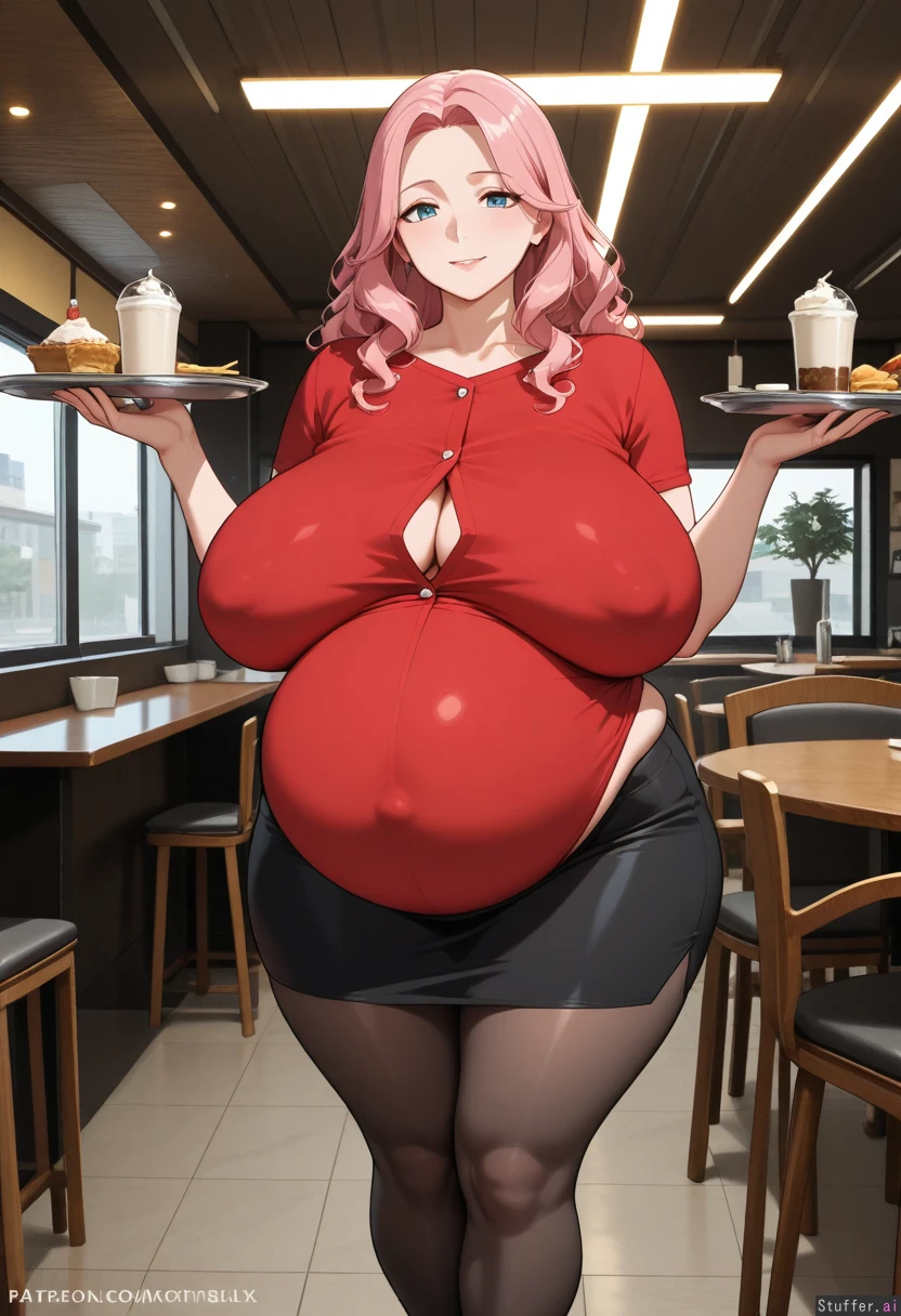 mature_female, pink_hair, long_wavy_hair, blue_eyes, restaurant, serving, white_button_up_shirt, black_skirt, tights, thick_thighs, potbelly, wide_hips, big_breasts, button_gap, chubby, sagging_breasts, bloated_belly, pregnant