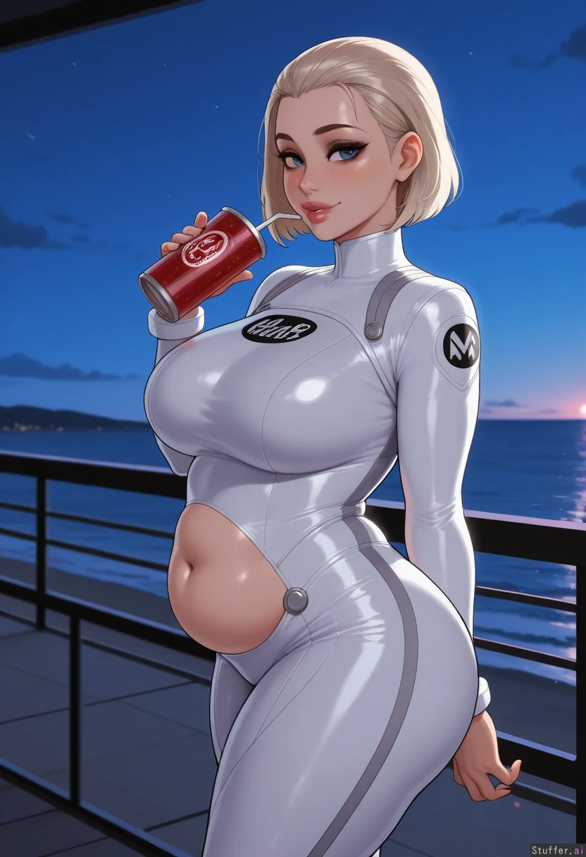 nyantcha:1.2), (krekkov:1.4), (reiq:1.1), (kittew:1.3), best quality, intricate details, hdr, detailed eyes, (soft shading), realistic, dim lighting, realistic lighting, anime, 1woman, (((Susan Storm from Marvel Rivals))), ((chubby mommy)), thin slicked back mullet short-cut straight_hair, hair behind ears, standing, teasing (drinking soda), looking at viewer (side view), flirty, platinum blonde hair with brown highlighted tips, dark blue eyes, black eyeshadow and eyeliner, lots of freckles, her bangs are platinum blonde, wide hips, huge thick thighs, large breasts, (chubby belly:0.2), tummy pooch, legs crossed, happy, sweet, nave, flushed, ((chubby:0.5)), chubby figure, fatass, small protruding belly, White futuristic form-fitting bodysuit, white Marvel future foundation symbol on chest, white bracelets, Beach at evening,