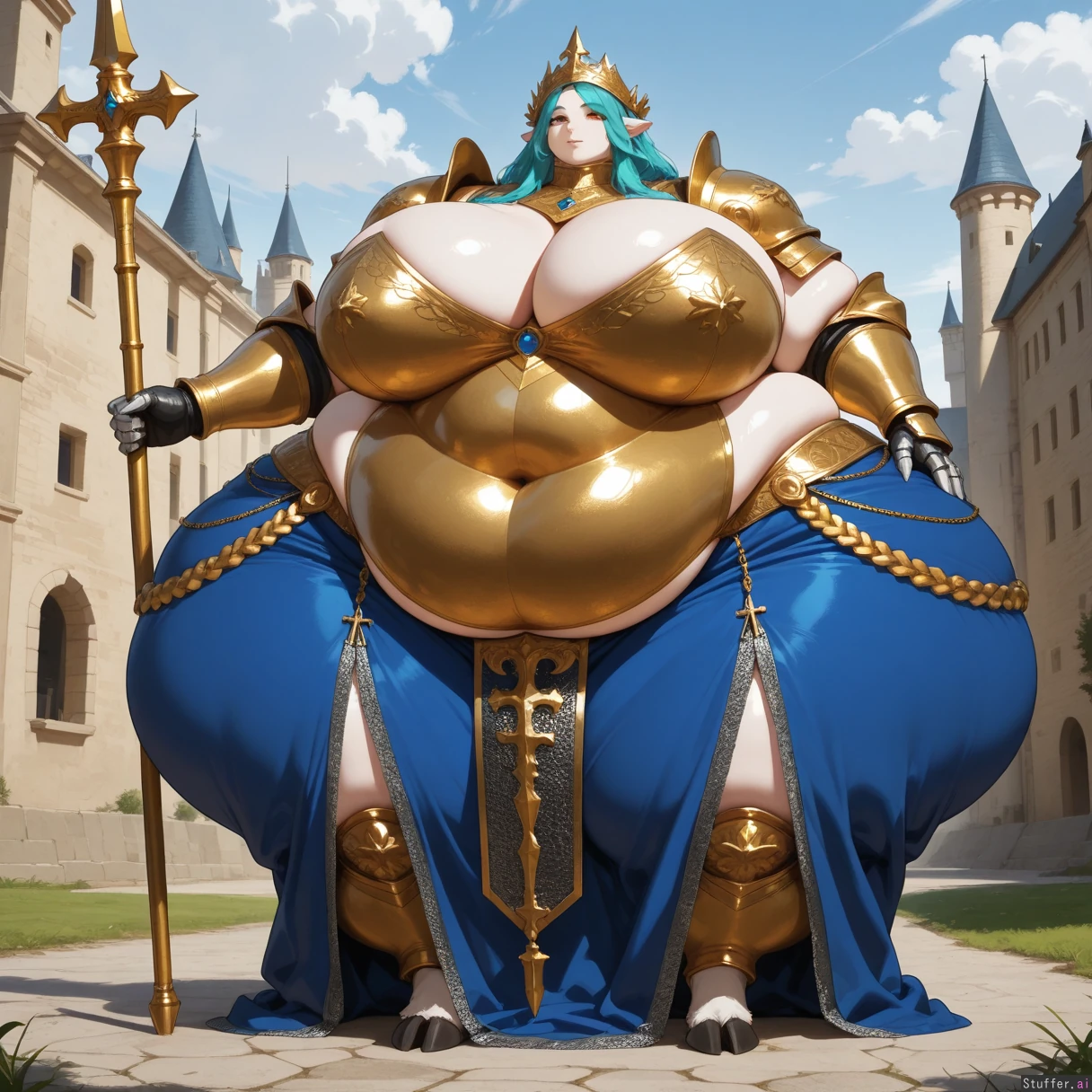 solo, anthro, (mlp), celestia, chainmail, tall, fat_arms, blue long skirt, bronze armor, cross, posing, full body view, long_hair, orange_eyes, fully_clothed, castle, outdoors, gauntlets, hooves, standing (huge hips:1.5), (huge thighs:1.2), (huge breasts:1.3), (ussbbw), (fat calves), (morbidly obese:1.4), (fat rolls), saggin_belly, exposed_belly
