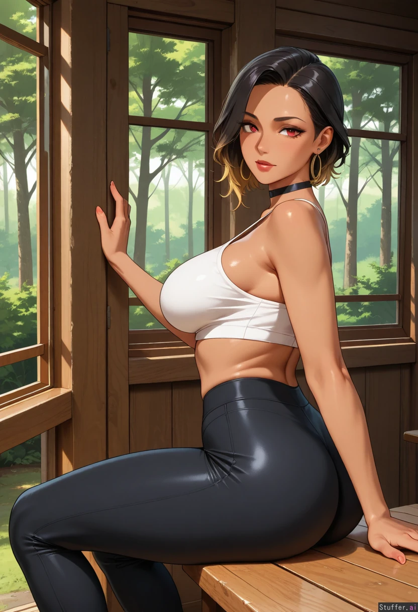 solo_female, mature face, tan, long_black_hair, asymmetrical, blonde_tips, red_eyes, choker, large earrings, sitting in_small_booth, window view of forest, midriff_exposed, white top, black yoga_pants ( ass_up)