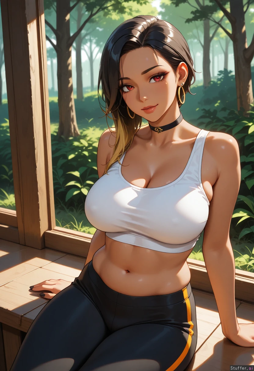solo_female, mature face, tan, long_black_hair, asymmetrical hair, blonde_tips, red_eyes, choker, large earrings, sitting in_small_booth, window view of forest, midriff_exposed, white top, black yoga_pants ( big_belly )