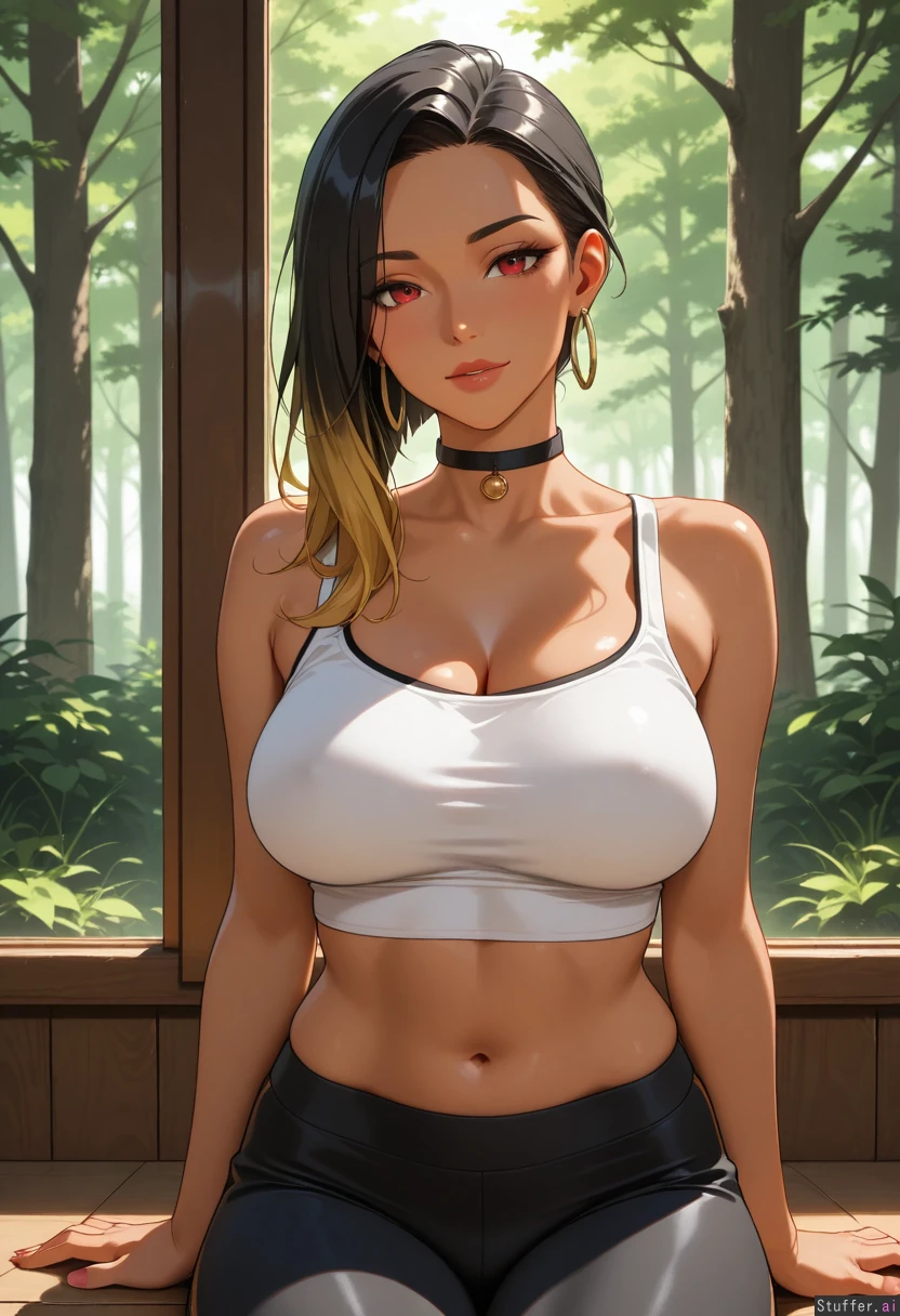 solo_female, mature face, tan, long_black_hair, asymmetrical hair, blonde_tips, red_eyes, choker, large earrings, sitting in_small_booth, window view of forest, midriff_exposed, white top, black yoga_pants ( clothed)