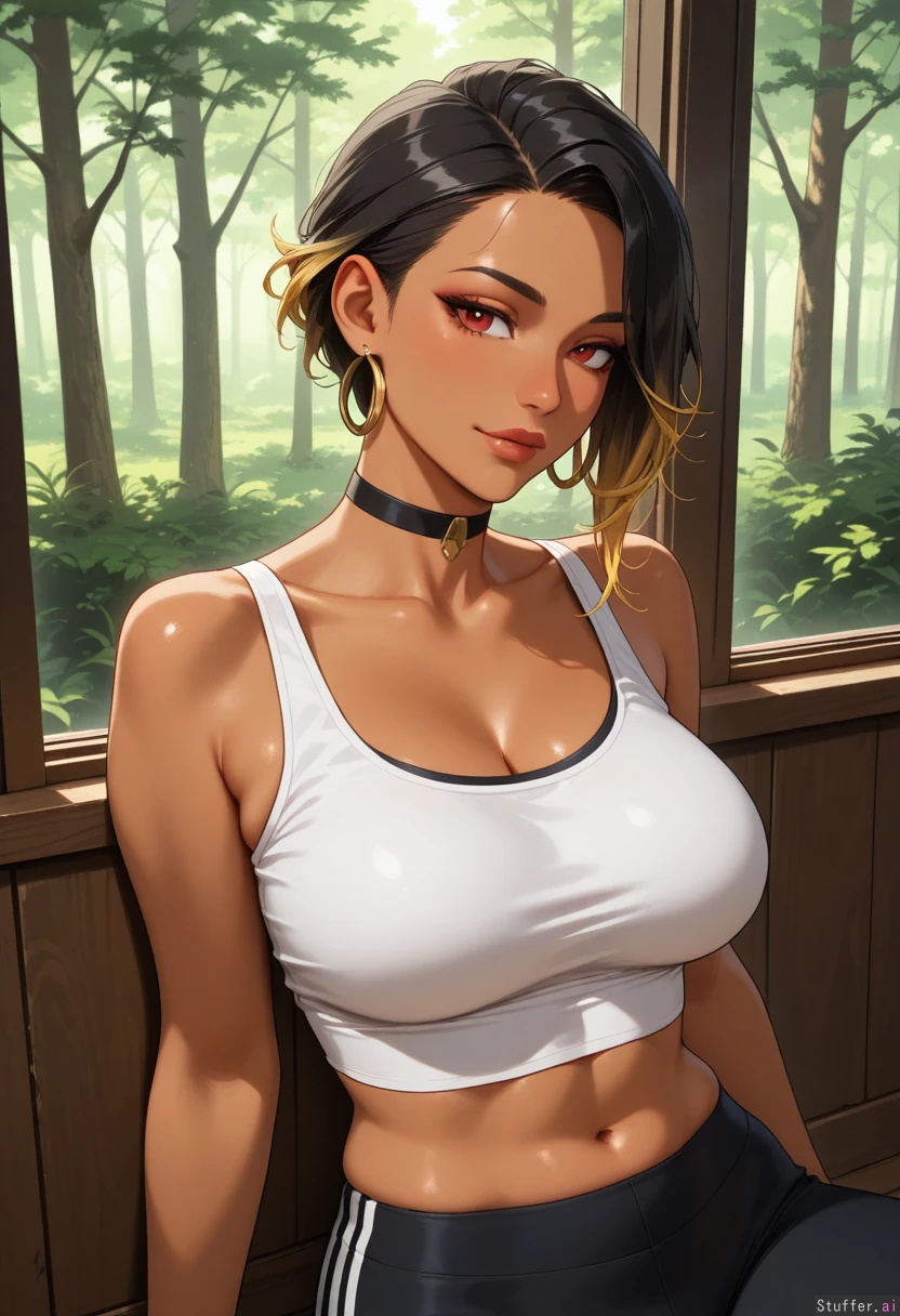 solo_female, mature face, tan, long_black_hair, asymmetrical hair, blonde_tips, red_eyes, choker, large earrings, sitting in_small_booth, window view of forest, midriff_exposed, white top, black yoga_pants ( clothed)