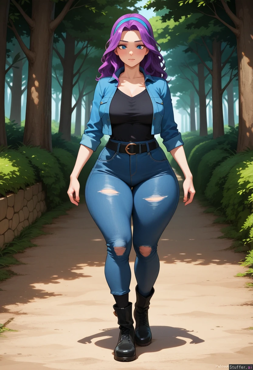 (perfect hands), 1girl, Abigail_(Stardew_Valley), fair skin, detailed blue eyes, long messy purple hair, blue hairband, Blushing, Wearing black tshirt, blue jacket, distressed jeans, black belt, black socks, black boots, Soft full breasts, wide hips, thick thighs, digitigrade paws, four toes, Walking, Background: forest pathway,