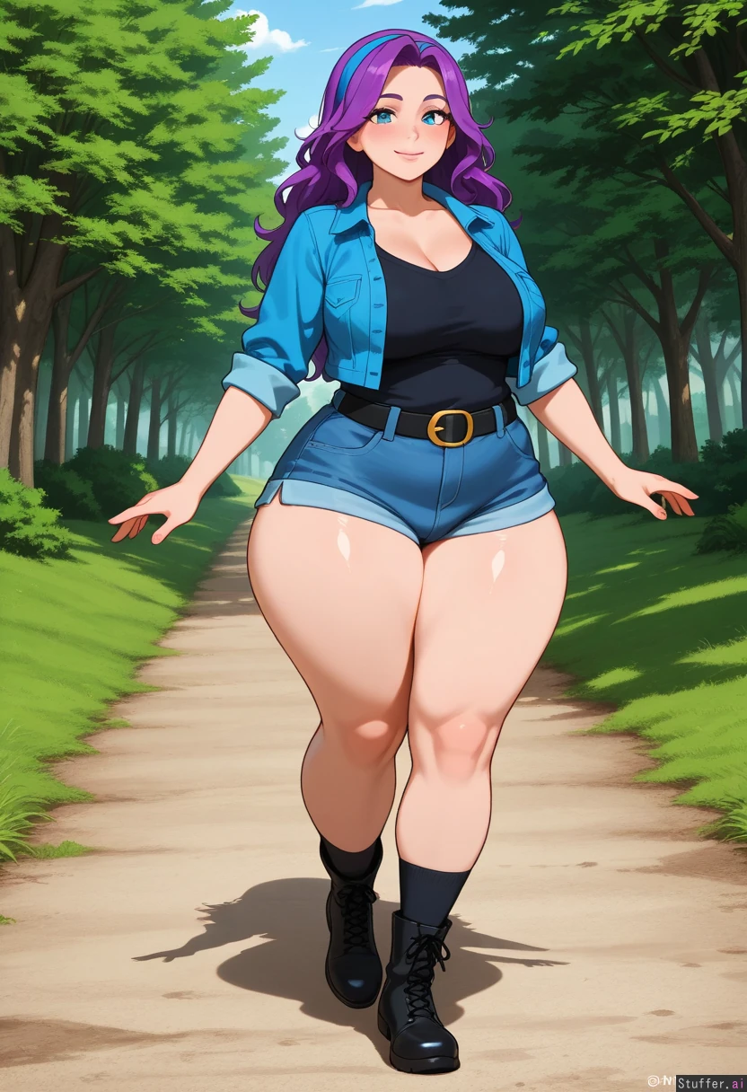 (perfect hands), 1girl, Abigail_(Stardew_Valley), fair skin, detailed blue eyes, long messy purple hair, blue hairband, Blushing smile, wave, Wearing black tshirt, blue jacket, jean shorts, black belt, black socks, black boots, Soft full breasts, wide hips, thick thighs, chubby, Walking, Background: forest pathway,
