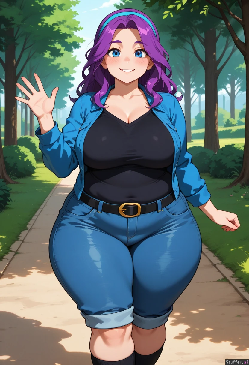 (perfect hands), 1girl, Abigail_(Stardew_Valley), fair skin, detailed blue eyes, long messy purple hair, blue hairband, Blushing smile, waving, Wearing black tshirt, blue jacket, cutoff jeans, black belt, black socks, black boots, Soft full breasts, wide hips, thick thighs, chubby, Walking, Background: forest pathway,