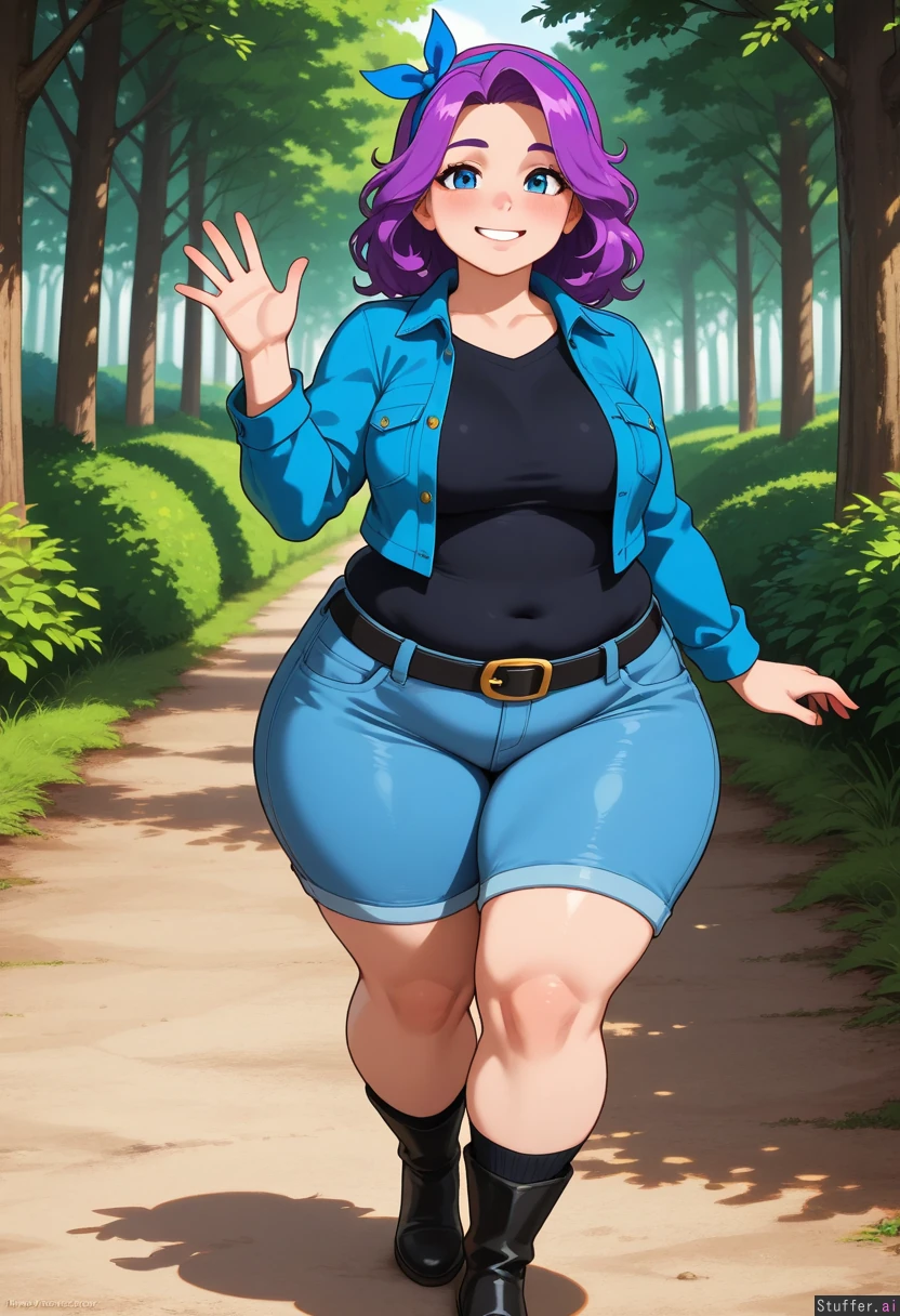 (perfect hands), 1girl, Abigail_(Stardew_Valley), fair skin, detailed blue eyes, long messy purple hair, blue hairband, Blushing smile, waving, Wearing black tshirt, blue jacket, cutoff jeans, black belt, black socks, black boots, Soft breasts, wide hips, thick thighs, chubby, Walking, Background: forest pathway,