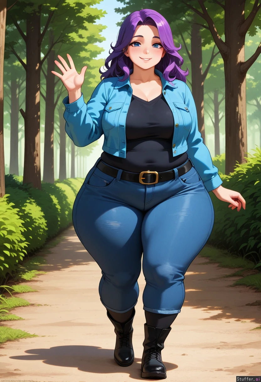 (perfect hands), 1girl, Abigail_(Stardew_Valley), fair skin, detailed blue eyes, long messy purple hair, Blushing smile, waving, Wearing black tshirt, blue jacket, cutoff jeans, black belt, black socks, black boots, Soft breasts, wide hips, thick thighs, chubby, Walking, Background: forest pathway,